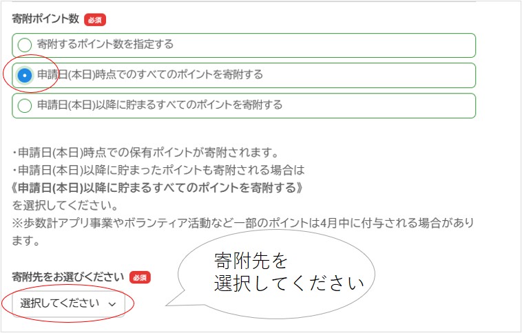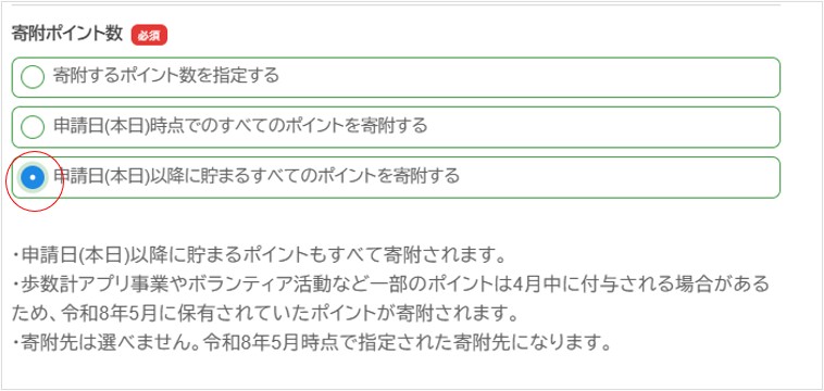 《申請日(本日)以降に貯まるすべてのポイントを寄附する》